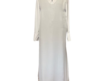 Items are made to a stock. The patterns are front and back. It is a long and narrow robe that fastens at the neck with loose sleeves.